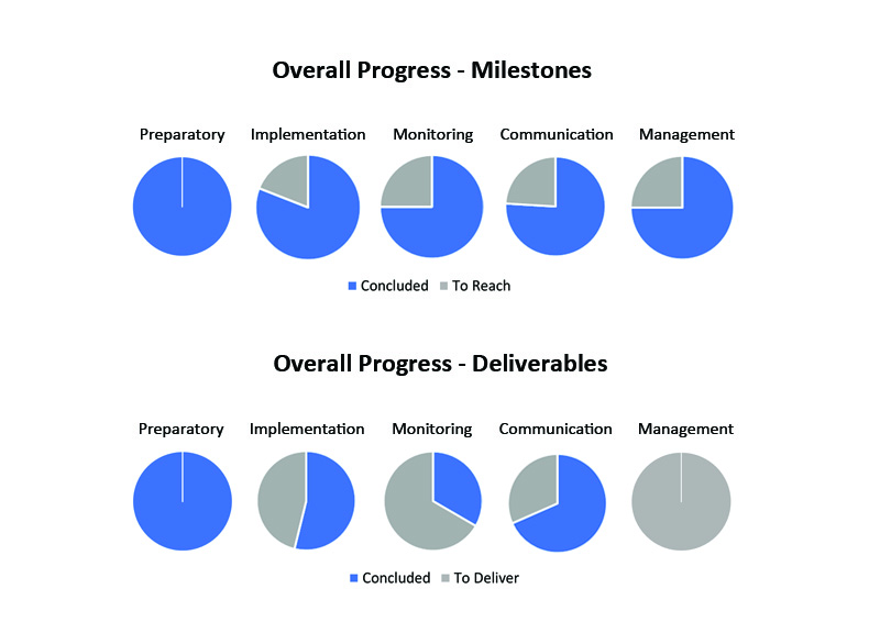 Overall project progress is assessed to be around 60% of its targets. Details on deliverables and milestones reached until now, for each of the main actions/works, are presented below.